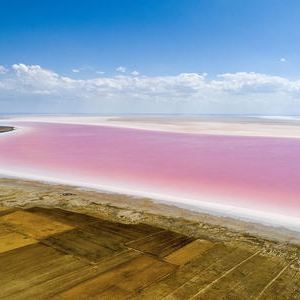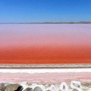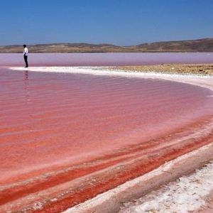 图兹湖的湖水由于含盐量较高,呈现出非常漂亮的浅粉色。粉红色的湖水在周围白色的盐滩映照下更显幽静美丽。湖泊周围还有大片的麦田以及碧绿的草地,景色非常宜人。